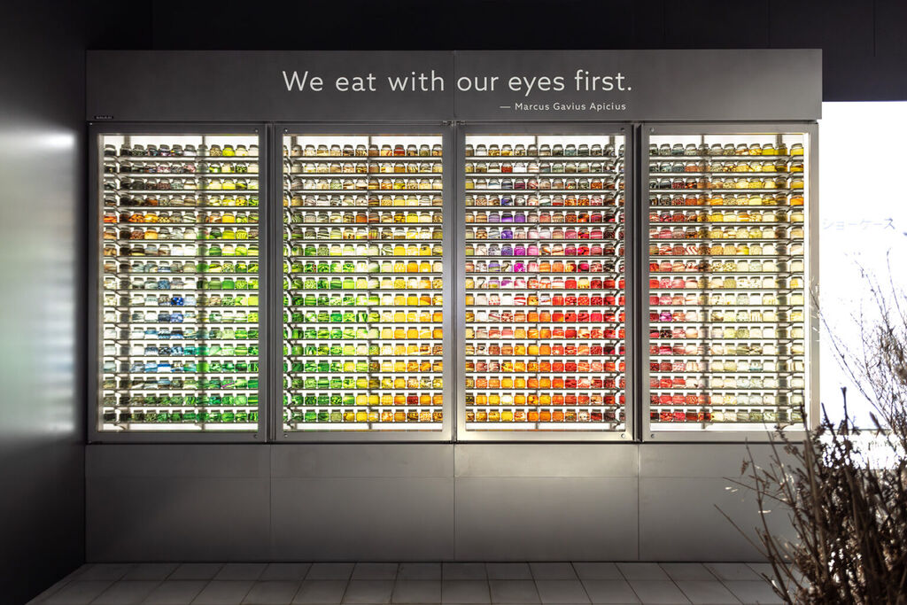 進入生命的樓層,從各種食材切入,首先「02.生命的顏色」從816種顏色的300種食材玻璃罐展開序幕,這些都是日本人平常會吃的食菜。