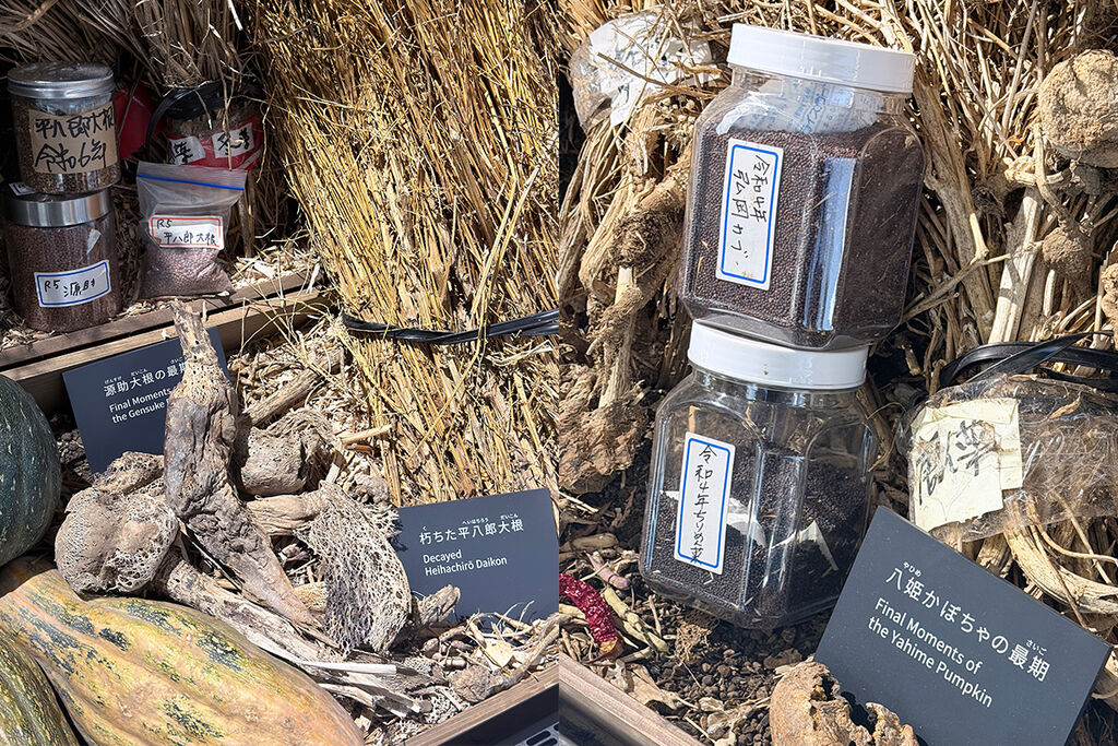 這裡展出的所有作品,全都來自長崎縣雲仙市一位名叫岩崎政利的農夫,在他一年間的耕作循環中誕生的蔬菜田。在能大量栽培、經過品種改良的蔬菜背後,無數美味的在來種逐漸消失。消失的種子,一旦斷絕,就無法再復原。在這樣的時代裡,岩崎先生選擇了「延續種子」這條路──即使那是一條極為費工的農業方式,即使這樣的努力鮮少被人注意。他與妻子兩人,用心栽培了多達78種蔬菜。了解每一種蔬菜的個性,並非在收成後就結束,而是一直陪伴它們直到枯萎、採下種子。這一切,都是為了守護百年後未來的飲食文化多樣性。展覽中的蔬菜花朵,會在展期的半年之間隨季節更迭,陸續從雲仙的田間採摘展示。