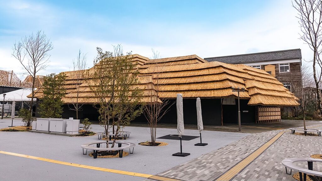 小山薰堂早在2021年就向建築師隈研吾提出邀請,希望他負責這座場館的建築設計,不過當時小山薰堂提出一項大膽的請求——希望由建築事務所裡的年輕人來負責。後來隈研吾在事務所內舉辦競圖,從7組參與的團隊中選出最後決勝團隊,以江戶時代依山而居的里山文化中,經常會出現的「茅葺屋根」為主要建築特色,從日本全國5個里山村落裡搜集需要的材料,送到萬博會場製作。