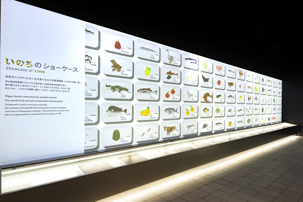 旁邊巨大的螢幕是「08.生命的櫥窗」,展示全球人類一年吃掉多少食材,像素風格的食材插畫很可愛,人類吃下的食材種類,比起其他的雜食性動物來說多了非常多,底下也有數據顯示地球上的人類一年會吃下多少該食材。比如說,人類一年會吃下419億隻雞!(驚)