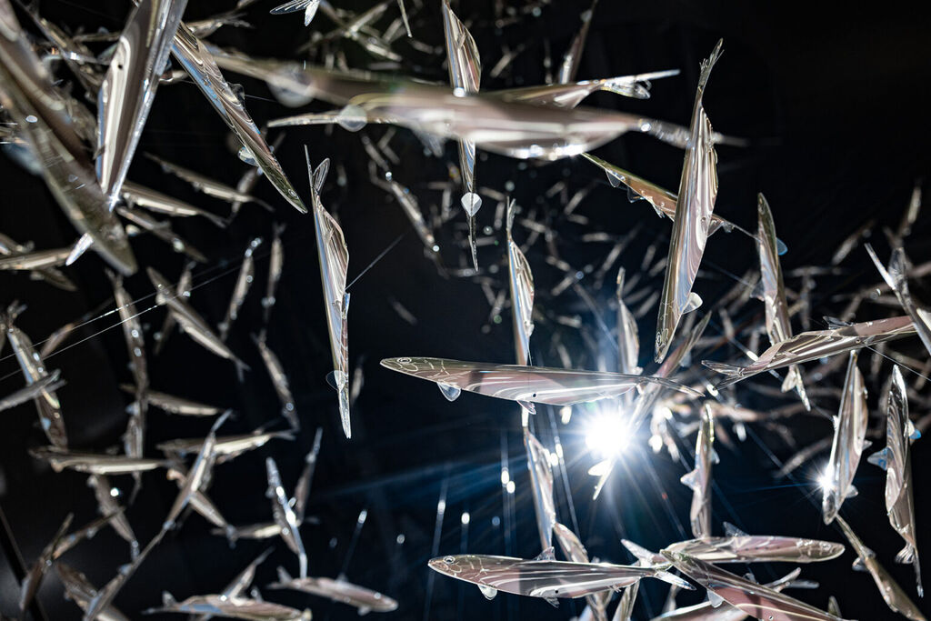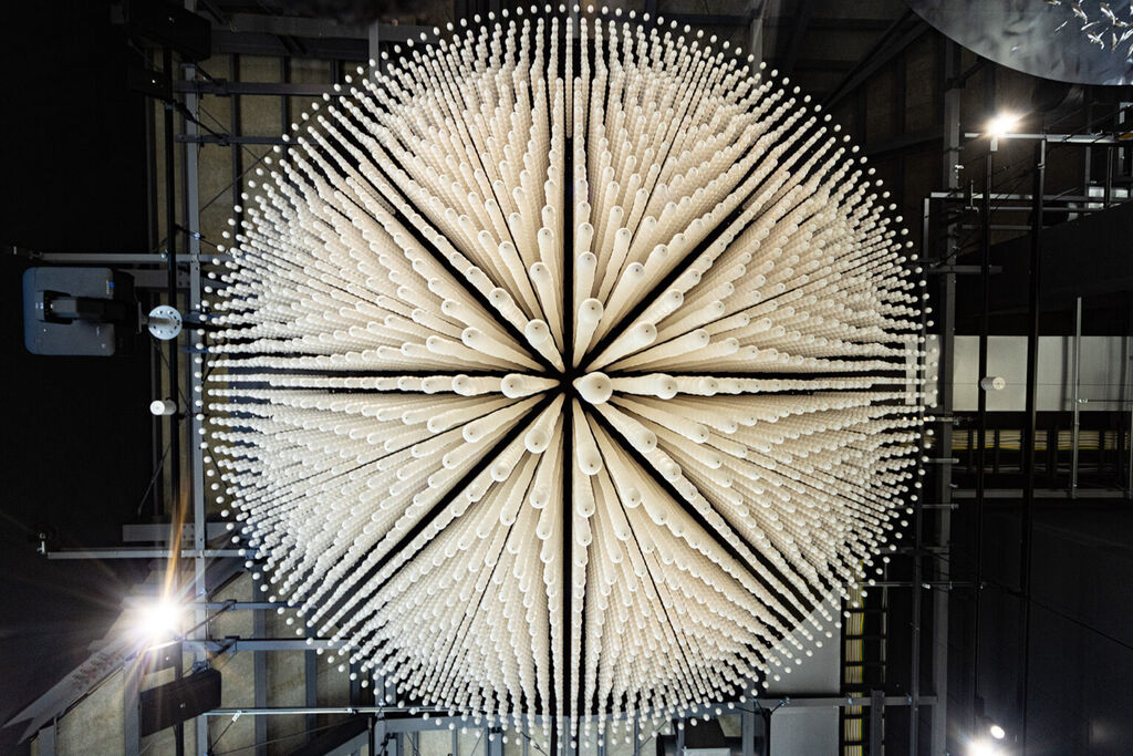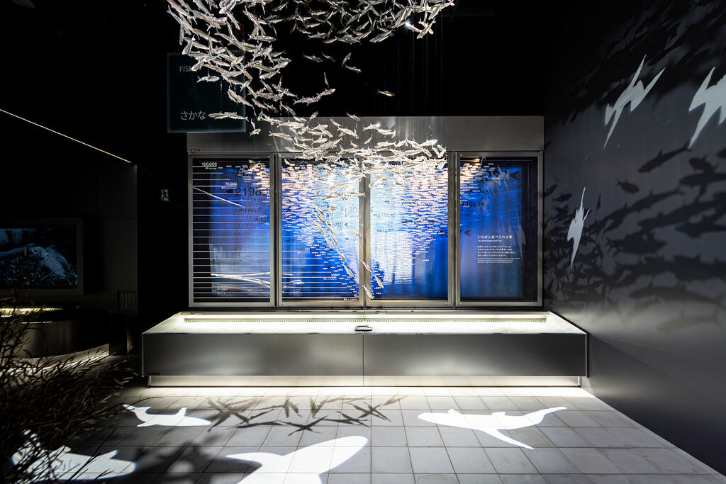 「07.一輩子吃下的雞蛋」則是展場裡最吸睛的藝術裝置。2022年,日本人平均每人一年食用的雞蛋數量高達339顆,位居世界第二。雖然每年數據會有些微變動,但自1980年以來,日本的平均蛋類消費量始終維持在每人每年超過300顆。若以近年數據為基準,並以日本人男女平均壽命約84歲來計算,一個人一生中大約會吃下28,000顆雞蛋,展場展示了以一位日本人的雞蛋年消費量做成的巨大吊燈。