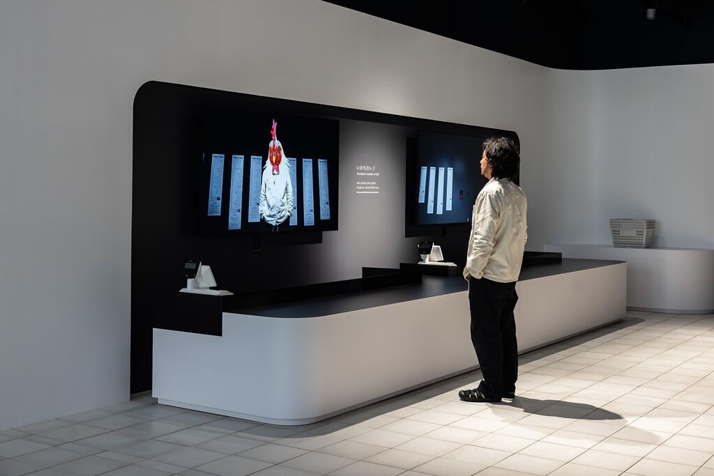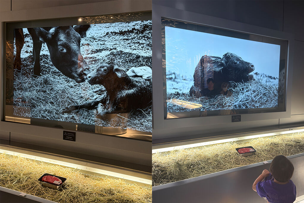 可能是因為看過「銀之匙」,此區電視螢幕展現的是由家畜攝影師「タキミアカリ」於2024年在三個牧場所拍攝的動物們,有豬、牛、雞。底下放著一塊寫著年份的牌子,代表各動物們的誕生時間,放在名牌下的,則是很常在超市看見的保鮮膜包起來販售的肉品。意思大概就是那些畫面中的動物後來會變成我們在超市中購買的肉類商品。讓我聯想到漫畫「銀之匙」中,主角在大學飼養的寵物豬最後變成香腸的故事。