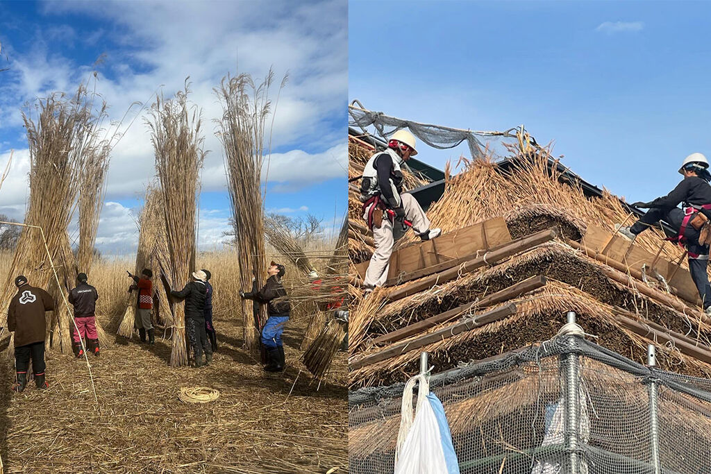 雖說名字有個「茅」字,但其實沒有茅草這種植物,主要是芒草、蘆葦等植物的總稱,茅草屋頂乍看不如磚屋木造牢靠,但其實充滿古人大智慧,屬於在山上容易就地取得的材料,只要由職人以交叉重疊的形式鋪設並捆綁固定,同時也因為莖的油份具有優秀的潑水性,就能成為遮風擋雨的屋頂,據說可使用30-50年。在材質老化後也能重新鋪設,替換下來的舊屋頂就能燒掉或掩埋成為肥料。