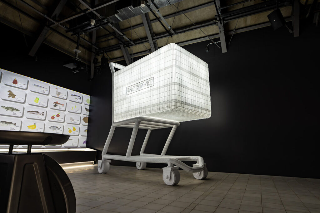 走到收銀機前,本來應該是要買食材的人類經過AR反而變成各種食材呈現在收銀台前。牆壁上則展示著不同國家的家庭,一週會消耗的食材種類與數量,以超市結帳後的收據形式呈現